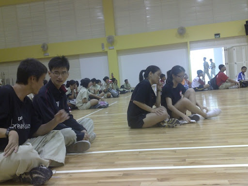after the class interactions.. they went back to the hall to hve the team building games.. super funny sia.. didn't really joined any particular grp.. just went around to check up on the oth grps.. and now and then i will be joining their games.. quite fun actually.. then it came to the singing of the sch song.. lol.. i was like making it as funny as possible.. becoz i noe the sec1s will be like super bored to tears.. lol..